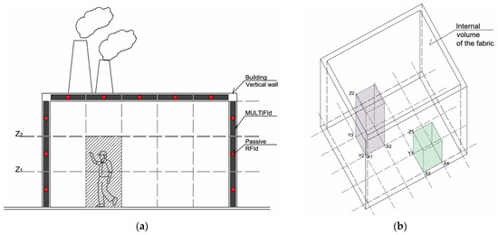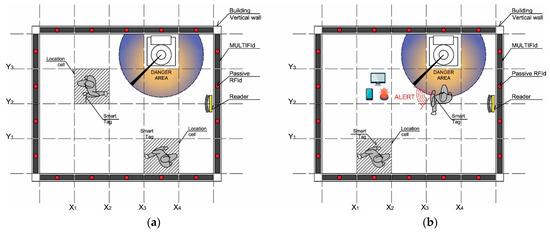 The idea is to use the above defined multifunctional panel on all walls of a facility, together with passive RFID tags suitably positioned on the walls, and a tag reader in each room. Thereby, a smart cell grid is created, as shown in Figure 6a,b, in the context of a typical room. The multifunctional panels, with embedded sensors, are represented by dark grey rectangles; the passive RFIDs are localized through the small red dots in the middle of each panel. A cartesian grid (x, y and z axes) is defined and localization of dangers or objects becomes possible, as each tag becomes an anchor point for the localization systems, driven by an active reader. The environmental conditions are monitored through the Farsens sensors, as well as through the positions of critical elements and operators. In fact, if operators are equipped with passive tags, their position and relative distance from critical objects can be easily identified. In Figure 7, an example scenario is provided; if an operator, provided by a passive tag (for instance, a wearable or an armlet device), moves close to an unsafe area, it is localized by the reader close to a danger tool, and some alerts could be automatically activated to discourage further action or to warn those in charge of surveillance.
