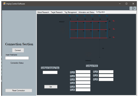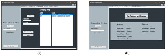 Software has been developed in Visual Studio as an .NET desktop application. Octane SDK libraries have been used for the management of the reader and the communication settings. Great effort has also been devoted to the localization of tags, as different algorithms have been tested and evaluated. As discussed in the previous section, the solution to split the volume in location cells has been adopted, defining a set of anchor points on the multifunctional panels. A simple user interface has been realized for testing the system, as shown in Figure 8. In Figure 8a, the database access and management shell are reported, while in Figure 8b, the reader status can be monitored.