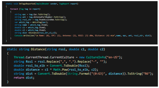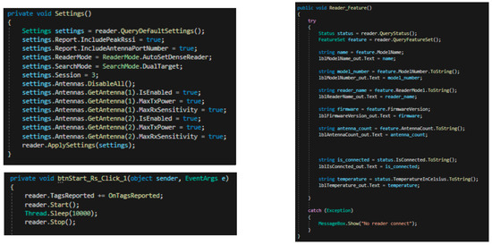 Following the operation steps, first, a connection is established with the reader, which is then configured with the setup that has been chosen for the selected room where multifunctional panels have been installed. Tags’ interrogation is carried out for each zone, in which the volume has been divided and data are stored in a dedicated database. Single calls to the database can be performed to check if a tag has been read or when it is read. In Figure 9, some sections of the code that have been developed are reported for the purpose of illustration.