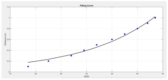 Preliminary tests have been organized in the university laboratory, in order to monitor sensors’ detection and communications. The reader that has been chosen is the Speedway from Impinj [29], which is a high-performance RAIN RFID fixed reader that delivers the flexibility and reliability necessary to provide effective item visibility. As a laboratory test, the required radiation power that was necessary was not very high, but without lack of generality, the test can be extended also to larger distances by choosing a more powerful reader. As shown in Figure 10, two antennas have been used and some sensors have been placed on the floor, where a location grid has been drawn, simulating the effects of the multifunctional panels. When the reader is activated, it can be managed by the console shown in Figure 11; the average RSSI is calculated on the reference line and the distance is computed as a consequence by means of the code sections reported in Figure 12. Considering the test structure of Figure 10, no transmission faults have been observed. The computed distances demonstrate an average relative error of about 5%, with respect to the real ones. In Figure 13, an example is reported, illustrating the measured distance as a function of the RSSI.