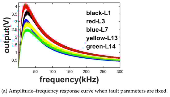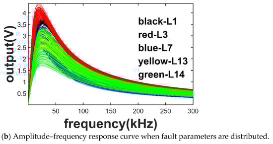 Figure 5a shows the amplitude-frequency response curves of 100 times Monte Carlo simulation for L1, L3, L7, L13, and L14 faults with fixed fault values. Figure 5b shows the amplitude–frequency response curves with the fault distribution uniform in an extensive range. When a fixed fault value is adopted, the amplitude–frequency response curve of each type of fault is relatively concentrated, and the curve characteristics between each type of fault are apparent, and the identification degree is high. When the fault value is distributed in an extensive range, the amplitude–frequency response curve of each type of fault is wildly divergent, and the curve features of each type of fault overlap more. The identification degree is low, which significantly improves the difficulty of diagnosis.