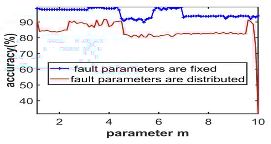 Since the fuzzification parameter m in the membership function will affect the output of fuzzy mutual information, which may affect the output of EmRMR, the classification accuracy of different values of m is tested. It can be considered that when the number of selected dimensions in EmRMR is fixed, that is, when the feature vector is in the same feature dimension, the influence of m value on the accuracy of test classification can be characterized. As shown in Figure 6, different m values from 1.1 to 10 are tested. In this example, when the fault parameters are fixed, due to the strong independence between features, the influence of m on the accuracy is limited, and all values can ensure very high classification accuracy. When m is 4.3, the classification accuracy is the highest. When the fault parameters are distributed, the overlap between features is severe. At this time, the fuzzy parameters have a certain impact on the classification accuracy. When m is 3.9, the classification accuracy is the highest.