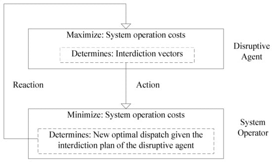 Electric power systems (EPS) play a key role in modern society since the productivity of industries and welfare of communities largely depend on their appropriate functioning. Therefore, power system operators and planners must make efforts to guarantee the quality and continuity of energy supply. Unfortunately, EPS are vulnerable not only to natural events, but also to malicious attacks [1]. These disruptive events bring along high operating costs, due to unforeseen changes in the initial dispatch plan, repair costs of elements such as lines, transformers, and towers, as well as eventual compensations to consumers due to load shedding. Power system operators are in charge of assessing such costs and developing strategies to minimize the impact of eventual outages [2]. Since the costs of outages are high for both the consumers and the network operator, it is necessary to establish strategies before, during and after an attack to mitigate the impact and duration of service interruptions [3]. Due to the fact that transmission networks operate over a wide geographic area, they are particularly susceptible to deliberate physical attacks. In this case, there is a disruptive or malicious agent that wants to cause damage to the system. This agent has access to the system data and has limited economic resources to execute its objective; therefore, such an agent must determine a set of elements to render out of service with the aim of maximizing damage to the network. At the same time, the system operator must react to the attack to minimize the damage. This attacker–defender dynamic was initially modeled in [3] through a bi-level programming approach. In this case, the authors propose analytical techniques to help mitigate the disruptions to electric power grids caused by terrorist attacks. They also identify critical system components (lines, generators and transformers) by creating disruptive attack plans, assuming limited offensive resources. From the seminal work developed in [3], many models and techniques have been proposed to approach the vulnerability assessment of power systems, bearing in mind intentional attacks; this is also known as the electric grid interdiction problem (EGIP).