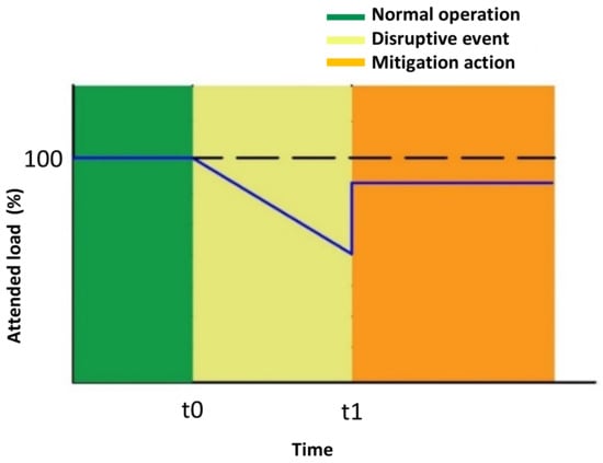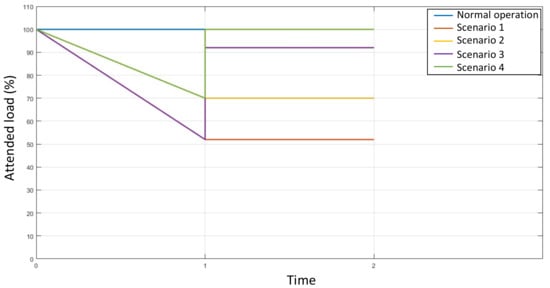 Figure 2 illustrates the percentage of load attended between periods t0 and t1 depending on the infrastructure that remains in operation after the execution of the disruptive event. The slope between t0 and t1 represents the loss of load due to an attack. Once this happens, the network operator executes an optimal dispatch to mitigate the effect of the attack, using the available network resources.