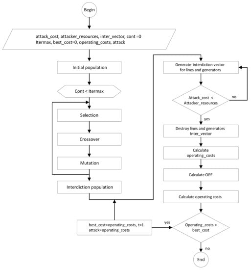 GAs are metaheuristic techniques inspired by the Darwinian theory of evolution. These types of techniques have been successfully applied to solve bi-level programming problems [24,25,26]. Figure 3 depicts the flowchart of the implemented methodology, which includes the GA. In this case, a candidate solution or individual is represented by means of a binary vector that represents the lines and generators out of service.
