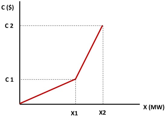 The disruptive agent attack plan is represented as an interdiction vector for lines and generators in binary coding, where an attacked element is expressed by Equation (1). The costs assigned to the generators are defined by a first order polynomial model; the load shedding and DR costs at each of the nodes are determined by a piecewise linear model. Unlike the polynomial model, the piecewise linear model allows characterizing the load cost as a function of discrete conditions [31]. Figure 4 and Equations (17)–(19) represent the scheme for cost allocation in loads where y c2 are the uncertainty costs, x1 and x2 are the power demanded, and m1 y m2 are the results of the operation of costs and minimum and maximum power at the loads.