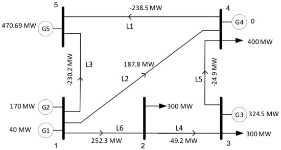 The proposed vulnerability analysis was initially applied to a power system composed of five buses and five generators for which data can be consulted in [36]. This power system is illustrated in Figure 5.