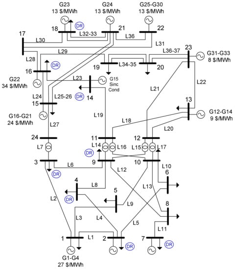 The EGIP was initially proposed in [3]. In this case, the objective function of the terrorist and system operator are the maximization and minimization of the load shedding, respectively resulting in a max–min optimization model. In [4], the authors propose a generalization of the EGIP by introducing different objective functions for the terrorist and the system operator. The new model also allows the imposition of constraints on the outer optimization that are functions of both the inner and outer variables. After a given attack, the system operator usually resorts to the use of a new generation to minimize the system load shedding; nonetheless, in [5], the authors propose line switching as an alternative method to protect the system. In this case, a genetic algorithm (GA) is in charge of finding a new system topology that would mitigate the effects of an attack. In the face of a disruptive event, the system operator may also take advantage of distributed energy resources (DERs) to provide an alternative to supply some critical loads while the lost infrastructure is reestablished [6,7]. Distributed generation (DG) and demand response (DR) are types of DERs that increase capacity to effectively transfer power from generators to loads, decrease the power demand on loads through bilateral agreements for voluntary disconnection and minimize load disconnection costs while recovering lost infrastructure [8], which is reflected in the increased flexibility, robustness and reliability of the power system [9].