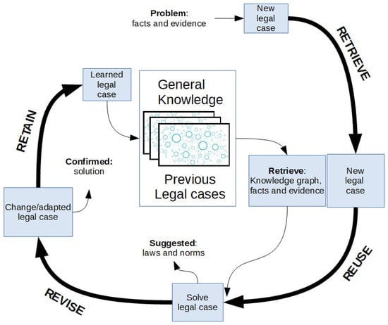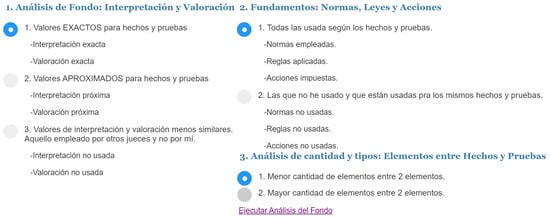 Various investigations try to obtain knowledge from past cases using the traditional Case-Based Reasoning (CBR) approach in a legal context, such as [3,28,30,38,39,40,41]. In those systems, CBR consists only of solving current cases according to how previous ones were solved, that is, in a deterministic way. This kind of solution is different in capturing the judge’s interpretation and assessment of facts and provides an intelligent simulation [42,43,44,45] that allows a legal analysis about the merits of the case. This approach is an understudied approach concerned in identifying the perception of a judge about the objects and relationships of the real world involved in a case, along with the machine’s ability for capturing and processing that information and explaining it graphically on an interface [46].