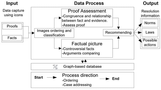 Data overview diagram of the system: Image inputs, evidence and facts processing, and norms and laws outputs.