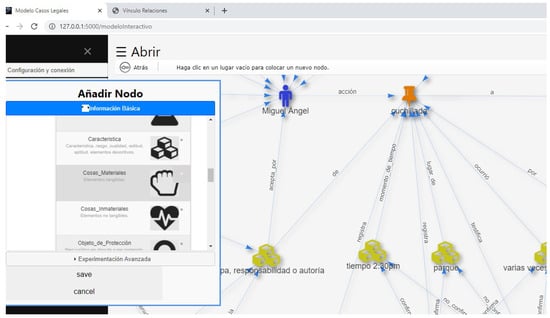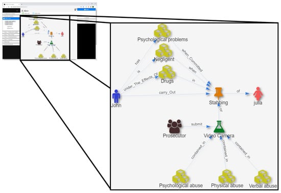 The judge can access graphic resources in the form of images representing legal elements [16] which are pieces of juridical data made of evidence and facts, as shown in Figure 7. An EGI offers the judge a popup menu to select the image that best reflects a record entry from the expedient. In addition, the system has a drawing area called working canvas where the judges can draw their perception of the scenarios by establishing, organizing, distributing, and relating the images that they select from the menu, as shown in Figure 7. The KGs built with the images are stored in an unstructured database, and when this happens, they become a more specific type of graph called a Property Graph (PG) [69,70,71].