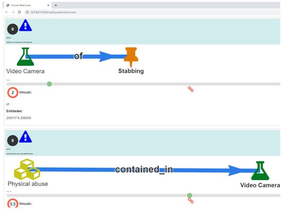 Given the above, Equation (1) shows a case with a set of relations R for a set of nodes that constitute the legal elements and describe the V scenarios of the factual picture that occurs in a p context. The relations and nodes were created from the transformation of interrelated images using the graphical interfaces of the artifact, and an index is an internal number that the machine assigns to the description of the context given by the judge, for example, “”: