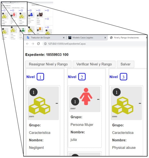 The data overview diagram of the system consists of image inputs, evidence and facts processing, norms and laws outputs, CBR articulating and processing the information between the user and machine; organizing the inputs and outputs of the system as depicted in Figure 2. The role of EGIs is to provide graphical interfaces that are used for human interaction with a computer, called Human-Computer Interaction (HCI) [53], an example of the interface is shown in Figure 3. The graphical techniques of the interfaces allow the elicitation of human knowledge using the ligaments between the shape of images and the content of its attributes, as well as the relationships between images. This means a meta-media to manage higher-order thinking by combining the functionality of the EGIs, for example, by combining the functions of the interfaces of Figure 4 with Figure 5. This combination makes it possible to work with the range, importance level, order, and attribute links between images. The role of IA-AI is to obtain the perception of a human from the dynamic triangulation of attributes expressed with images, relationships, and unsupervised algorithms [2].