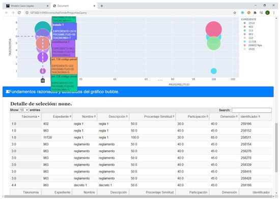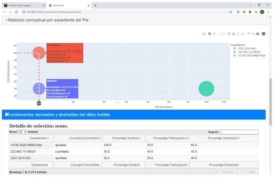 In Figure 12, the percentage of participation represented by the Y-axis is used to explain the level at which the concepts or objects of the current case are within the factual picture of other cases. The X-axis is used to explain the level of similarity that the concepts have between the cases. The size of the circles represents the dimension or level of importance of the scenarios within the files. The machine recommends the group of files distributed and located higher or more to the right of the graph. The machine handles each fragment as a collection of nodes to describe the interpretation of juridical objects and the assessment of a juridical concept. In this way, it has been possible to investigate the legal explanations related to the inferences [93] obtained by the system.