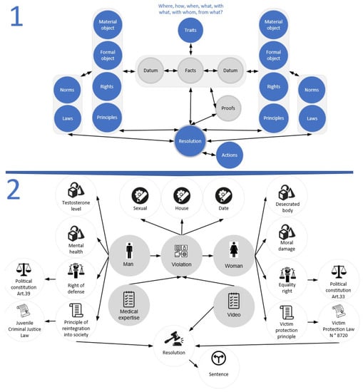 An in-depth legal analysis is the identification and description of both data and relationships within each scenario. The judges do this analysis as they work through the case during the trial. To exemplify the data and relationships, consider the data model of segment 1 in Figure 11 where bidirectional arrows represent that a relationship can go one way or the other from concepts or objects, and it demonstrates the organization and relation of the meta-knowledge. In this figure in segment 2, a simplified real world example of a “violation case” uses the data model from segment 1. The elements called “Material Object” and “Formal Object” broach the subject of each scenario; for example, in this figure, there is a case of a man affecting a woman through the action of rape. In [89] a formal object means carrying out a legal study, from a particular perspective, on the relationship of legal data; the material object is the matter that deals with such data, but in this case, all the relationships that describe each object are also represented and organized.