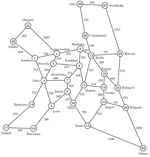 We used the network traffic model proposed in []. The model considers network operation within a given time perspective T (specified by the number of time points/iterations) and ensures that the average traffic volume a each time point is equal to Gbps. Traffic grooming was applied on the level of a pair of communicating nodes, and at each time point, the model allowed assessing the total bit rate currently observed between each pair of nodes. In order to verify whether a request had just arrived or expired, it was necessary to compare the current flow value with the observation from a previous time point. Four traffic types were considered—city-to-city, city-to-DC, DC-to-city, and DC-to-DC. City-to-city was observed between each pair of communicating nodes and represents a general-purpose data transmission between different cities. City-to-DC and DC-to-city affect each pair of a city and assigned DC node (each city node is assigned to the closest DC from available DCs) and reflect a request and provision of DC-related services. Eventually, DC-to-DC occurs between each pair of DC nodes and expresses an inter-DC synchronization. For a particular pair of communicating nodes, the time process of each traffic type was modeled using a trigonometric sine function, while the entire traffic was a sum of sine functions corresponding to the traffic types observed for that pair of nodes. The parameters of the sine functions (i.e., amplitudes, pulsations, initial phases) were properly designed based on the real characteristics of the cities corresponding to the network nodes (including gross domestic product and geographical distance). For a detailed description of the signals, refer to []. In this paper, we assumed 10,000, and differed depending on the number of DCs. For 3 DCs, it ranged from 675 to 850 Tbps, for 7 DCs from 575 to 750 Tbps, while for 11 DCs from 475 to 625 Tbps. To enable the network to reach a steady state, first, 1000 time points were not considered in the evaluation. For each pair of network nodes, the shortest candidate paths were computed.