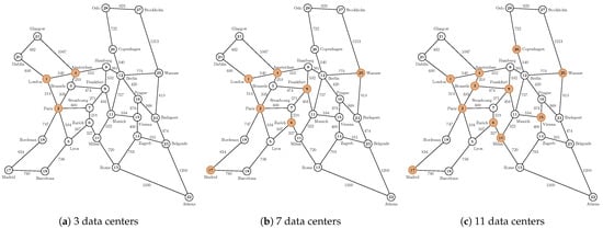 The numerical experiments were conducted to evaluate the performance of the proposed fragmentation-aware traffic grooming algorithm in an SS-FON. A European network (Euro28) topology was considered with 28 nodes, = 82 links, and 625 km of average link length (Figure 1). We assumed that each network link was a single-mode fiber bundle with 7 spatial modes. Each spatial mode provided 4 THz of optical spectrum divided into flexible grid of 320 slots, each of 12.5 GHz in width. In the network, data centers (DCs) were located at some of the network nodes. For simplicity, we assumed that the number of connections and the bandwidth between a network node and a DC were unlimited; thus, connections to the network nodes were equivalent to the connections to the DCs connected to them. Three scenarios were analyzed, where the number of data centers was equal to . The location of the data centers is presented in Figure 2, where the colored nodes represent the ones connected to the data centers. We evaluated two cases, with the spatial continuity constraint (SCC) active and with the SCC relaxed. The former one allowed decreasing the network nodes’ cost and complexity, but resulted in a higher restriction regarding the traffic allocation. The latter one allowed for higher flexibility at the expense of higher cost. Moreover, we assumed that the requests were allocated using only spectral SChs, i.e., that the SCh did not span across several spatial modes on a single fiber.