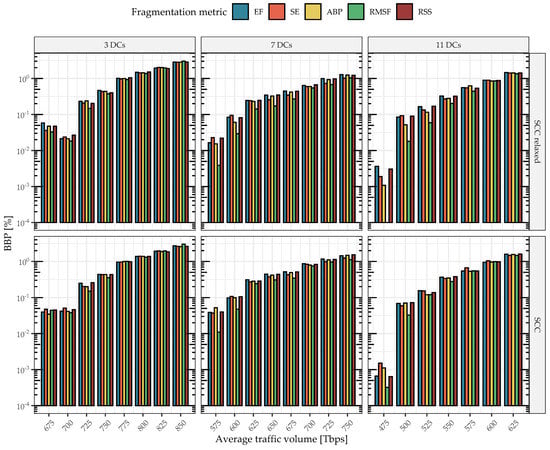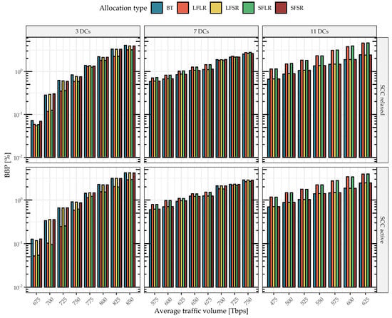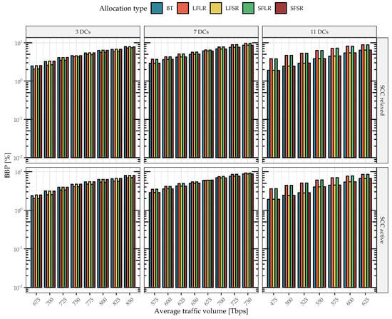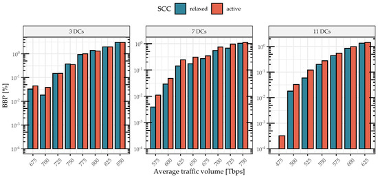 In the first experiment, various traffic grooming strategies were evaluated, namely the BT, LFLR, LFSR, SFLR, and SFSR for FF-TG and kFF-TG. Figure 3 and Figure 4 present the BBP as a function of the average traffic volume between each pair of nodes for various allocation strategies, for FF-TG and kFF-TG, respectively. The results are reported for different numbers of DCs, with the SCC active and relaxed. As can be observed, for different numbers of DCs, different sets of allocation strategies decreased the BBP. In particular, for three DCs, these were LFLR and SFLR, while for seven and eleven DCs, these corresponded to BT, LFSR, and SFSR. With the increase of the DCs’ number, it was more profitable to release traffic from smaller optical corridors first. Smaller SChs are usually built on top of the larger ones, which are created during the initial network setup. This was somehow confirmed by the similar good performance of the BT strategy that releases the channels from the top of the spectrum first. When the number of DCs increased, the DC–DC and client-to-DC connections dominated the network, creating complex traffic patterns that could change during the network lifetime. Therefore, releasing traffic from small requests first sped up the recycling of the optical corridors used and the allocation of the same resources for other SChs. On the contrary, when the number of DCs was small, city-to-city was the dominating traffic type. In such a case, traffic was distributed more evenly in the network, and a more promising approach was to release the traffic from the larger channels first. Such an approach increased the reusability of the already created channels without the need for the constant deallocation and allocation of the SChs on the same path. Decreasing the number of smaller SChs in favor of larger ones decreased the number of slots wasted for the guardbands. As a consequence, this allowed a lower blocking probability and allocating a higher amount of traffic. In particular, around 1% was achieved approximately for 750, 600, and 475 Tbps of average traffic volume for 3, 7, and 11 DCs, respectively.