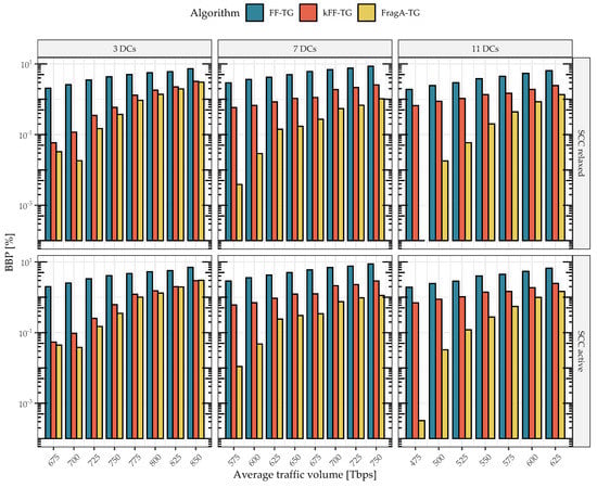 As the RMSF metric allows reducing the BBP the most, it was used in further experiments. In Figure 6, the FragA-TG algorithm is compared with the two reference ones, namely FF-TG and kFF-TG. In each case, FragA-TG was the best algorithm resulting in the lowest BBP. On average, the BBP for FragA-TG was 89.3% and 60.4% better than for FF-TG and kFF-TG, respectively. Moreover, when the number of DCs was higher, the amount of allocated traffic was lower for similar BBP levels due to the complex traffic patterns. However, FragA-TG can effectively reduce blocking, especially for lesser amounts of traffic. With the increase of the traffic load, fragmentation management became less effective. This can be reasoned, as the number of free contiguous blocks decreased when the network was congested, and all algorithms tended to select similar SChs.