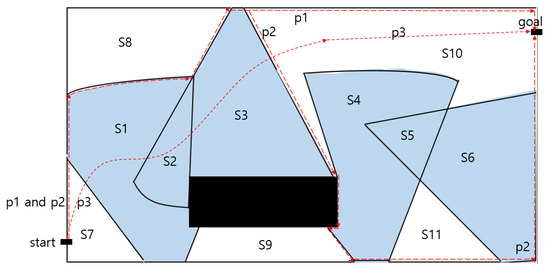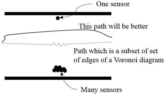 and an optimal path is the path that minimizes the exposure value. The authors first found an optimal path with one sensor. If the starting point is , the goal is , there is a sensor , and is the same as Equation (5) with and , then the optimal path is and the exposure along this path is . Based on the optimal path for a single sensor, they suggested a heuristic method for finding an optimal path with several sensors by running the Dijkstra algorithm map divided into horizontal, vertical, and diagonal grid lines. The authors of [4] defined a sensor as a cone and proposed a heuristic optimal path search method with several sensors by running Dijkstra’s algorithm in a map divided into horizontal and vertical grid lines.