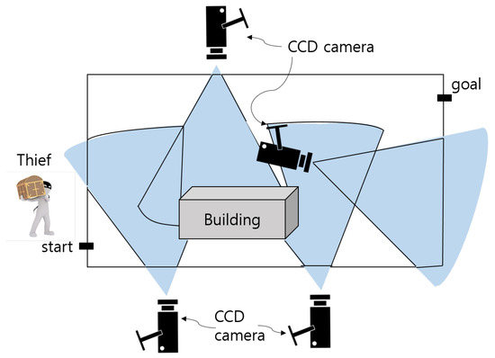 obstacle w is a rectangular area (Section 3.3). Thus, . If the sensing area occupies the back of the obstacle, it means that the sensor has a field of view on the back of the obstacle, so it implies the situation should be a 3-D model rather than a 2-D model. Therefore, it is assumed that there is no field of view behind the obstacle from the 2-D sensor. For example, Figure 2 shows a university dormitory area with four CCD (Charge Coupled Device) cameras and one dormitory building. A thief is at the start location, and the thief wants to get to the goal location while avoiding the sensing area of CCD cameras as much as possible. As the dormitory building is higher than any camera height, the camera’s field of view cannot reach behind the building (Figure 2).