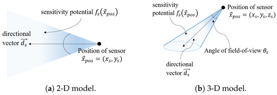 where is the noise potential, is a directional vector, and is the angle of the field-of-view; , , and are sensor-dependent constants (Figure 3). The given coordinate and position of sensor are determined according to the dimension of the guaranteed region, which is and for 2-D (Figure 3a) and and for 3-D (Figure 3b).