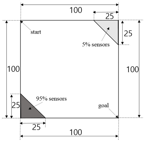 First, for the reasonable coverage of the map, the number of sensors n should be more than the number of obstacles m, and sensors almost cover the whole map. Then, the time complexity of Algorithm 2 becomes . Next, the shorter given path is, the smaller of the path is. If a feasible path is about a straight line from the start in the lower left corner to the goal in the upper right, the area ratio of to whole map is about , where is the average sensing area of sensors (Figure 7). According to the first assumption, . This induces the number of vertices and edges in “Divide with grid edges and set the values from sensing area data structure” as