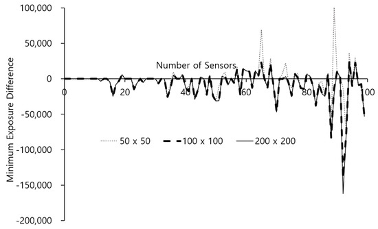 Minimum exposure difference from the minimum exposure value from the Voronoi Diagram (y) vs. number of deployed sensors following Figure 4. (x) in 100 × 100 area. Dotted line; 50 × 50 grids; broken line; 100 × 100 grids; solid line; 200 × 200 grids.
