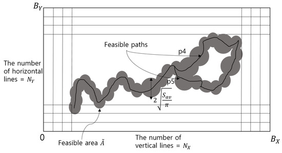 However, as N increases, becomes more accurate but the number of computations increase. To reduce the number of computations with the same level of accuracy, we decided to limit the area of interest in the target map, and this area is called the feasible area, . To find , the skeleton of the feasible area, feasible paths, should be defined. A set of paths following the boundaries of sensing areas is denoted as , and