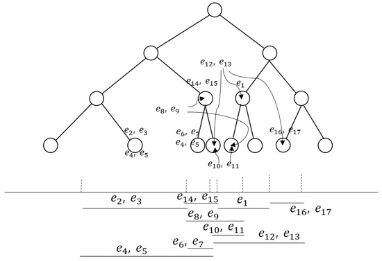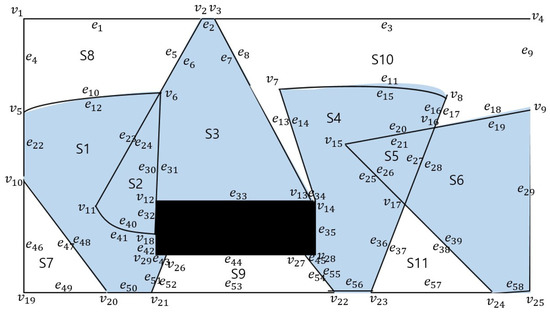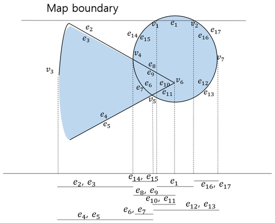 When a sensor is included in the map, intersections and the leftmost point and the rightmost point become vertices. A single line segment bifurcates into two edges if they have different exposure values. This rule has two exceptions: when the line segment is outside the map boundary and when it is inside an obstacle, because a target cannot go outside the map boundary or inside an obstacle (Figure 9). The edges created in this manner are stored in a segment tree (Figure 10). For each sensing area, information about edges, vertices, and the set of sensors that affect the sensitivity in that sensing area are stored.