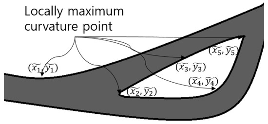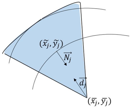 For a point at which the curvature is a local maximum, such as , where , the normal vector can be computed. is set to the opposite direction of , so because the directional vector and normal vector are unit vectors. Let be the position of s for the outer curve of , with the sensing area of s being tangent to each other (Figure 13).