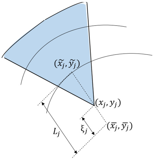 To compare the points in , the maximum increment coverage value should be selected. However, the increment value is only considered in the line between and because the error is not considerable. Let be the distance between and (Figure 14). By following variable between , the position varies. The outer interval of is not considered because the area of ( becomes smaller in the outer of the interval of the position of s. Therefore, the approximate maximum increment coverage value for is denoted as , and the corresponding is denoted as .