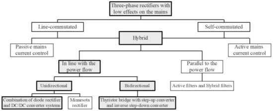 In Figure 1, a classification of three-phase rectifier systems for low and medium power is illustrated [5]. The focus of this work is related to the HTR in line with the power flow. These rectifiers (in line with the power flow) can be classified as unidirectional hybrid three-phase rectifiers (UHTR) and bidirectional hybrid three-phase rectifiers (BHTR), as shown in Figure 1 [5].