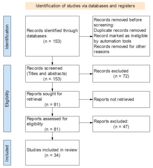 To select the studies considered suitable for this review, within the set of studies resulting from the consultations (153 articles), exclusion and inclusion criteria were thus elaborated, as mentioned in Section 2.3.1 and Section 2.3.2, consecutively. After these criteria were executed, 34 papers were selected, which in turn are applied to the data extraction phase.