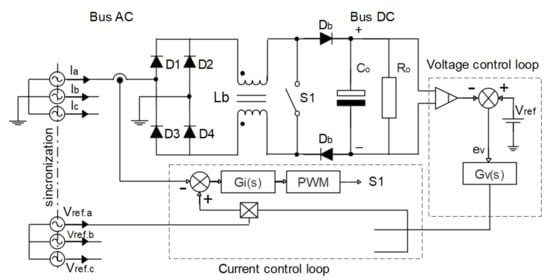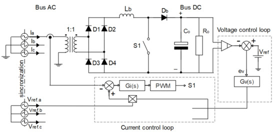 The structure of rectifier 1 can be formed in two modes; the first is formed only by a three-phase bridge with six pulses (GRAETZ bridge), while the second is formed by the three-phase bridge with six pulses (GRAETZ bridge) associated in series by a converter BOOST. In the first mode, the output voltage is not controlled, and it is not possible to impose the current waveform; in this case, the value of the output voltage depends on the value of the input voltage and the load consumption. In this mode, we can also implement a filter inductive at the input of each phase of the rectifier or implement the inductive filter at the output of the rectifier. These current waveforms, such as the rectangular one, are due to the activation of the diodes, which activate in a switching interval of (considering only a semi-cycle), thus conducting the current in this interval [20,23,25,28,31,36,38]. In the second mode, the GRAETZ bridge rectifier is connected in series with a BOOST converter to control the output voltage and reduce the ripples of the rectangular current shape. With an appropriate BOOST inductance value and with a suitable control loop (such as PWM) that provides the appropriate command to the power switch, it is possible to obtain practically negligible ripples on the inductor and a control of the average value of the applied output voltage to the load [2,16,26,27]. In this case, the control is done by two loops, the voltage loop, and the current loop, as shown in Figure 4. The voltage loop aims to keep the output voltage constant under load variations, and therefore, it receives an output voltage signal (through a voltage sensor) and compares it with a reference voltage () of the same value in order to produce an error () that will be used to change the amplitude of the current signal so that the PWM block can generate the proper pulse widths for controlling the output voltage. In this case, the current loop only has the purpose of imposing the current amplitude (by means of a reference signal of constant value), to allow a certain desired current value (thus allowing a better power distribution in the HTR) and rectangular in shape. Note that some hybrid structures (not all) may have the GRAETZ bridge rectifier 1 and BOOST converter with some minor modifications to allow a correct operation; the modification consists of dividing the BOOST diode and the BOOST inductor, as shown in Figure 4 [2,3,6,21,29,34].