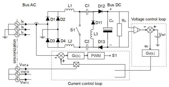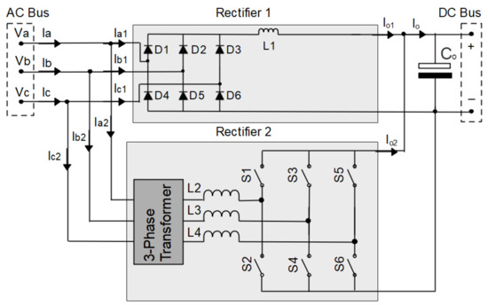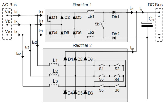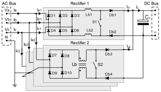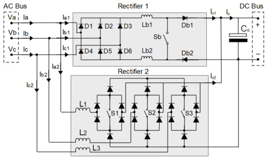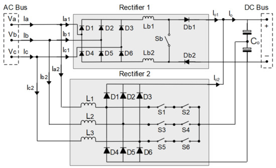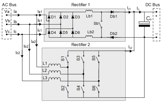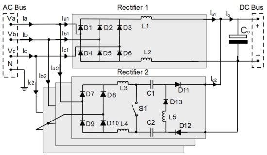 In this way, unidirectional rectifiers and bidirectional rectifiers can be used. In the case of a unidirectional rectifier, the modular three-phase rectifier with BOOST converter and PFC can be used [2,20,25,36]; the three-phase modular rectifier with SEPIC converter and PFC [16,23,28,29,38]; and the three-phase VIENNA rectifier with PFC [6,18,27], as well as their versions known as the three-phase Delta-switch rectifier with PFC [13,32,40] and the three-phase rectifier Star-switch with PFC [17,41]. In the case of a bidirectional rectifier, the three-phase PWM rectifier of the BOOST type with PFC can be used [26,31,34].