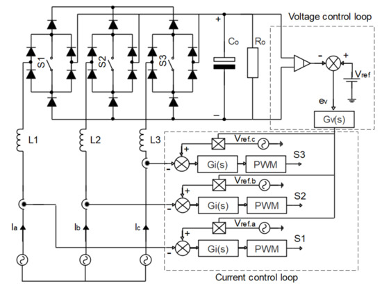 Unidirectional VIENNA rectifier: The two-level VIENNA rectifier is widely used, as shown in Figure 8. This structure works with the three phases without the need for neutral, and the inductor is implemented at the input of each phase of the rectifier, with each phase being controlled by a toggle switch. Control is also provided by two loops: the voltage loop and the current loop (one current loop for each phase). The process of the voltage loop and the reference signal that goes to the current compensator () for each phase is basically the same as that already described in the modular rectifier with the BOOST converter, as can be seen in Figure 8. However, in this system, each compensator of current () with the PWM modulator generates a gate signal suitable for the power switch (S) of the respective rectifier. It is important to note that when applying this classic control to this topology, there is a need to synchronize the carriers (“sawtooth” waves) of the PWM modulator in each phase. In this way, the control causes the cyclic ratio for the phase with the highest current (and the highest current reference) to present the highest cyclic ratio, respecting this condition for the controllability of the currents [6,18,27]. However, other versions of this two-level VIENNA rectifier, such as the Delta-switch rectifier and the Star-switch rectifier, were also studied and analyzed in more detail in Section 3.2.1.