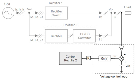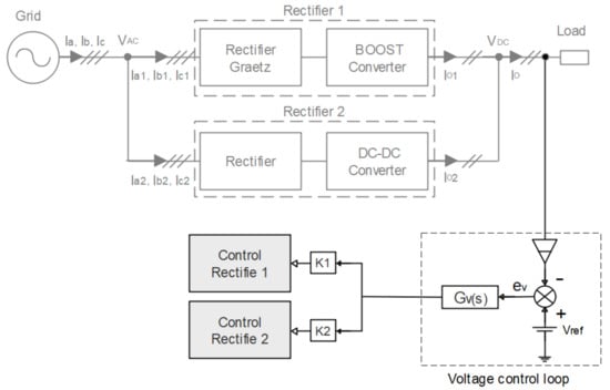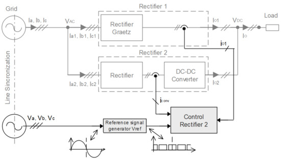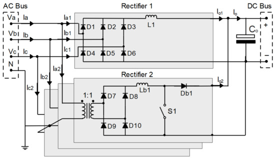 The HTR studied in this work can be analyzed as rectifiers with series or parallel connection between two (usually rectifier 1 and rectifier 2) or more rectifiers. Rectifier 1 is switched by the line, and in some cases, it can be connected in series with a DC converter to control the output voltage; it must also be designed in such a way that it processes the largest possible portion of the total energy delivered to the load. Rectifier 2, on the other hand, can be auto switched (controlling the output voltage) or even switched over the line, but connected without series with a DC converter to control the output voltage and carry out the active power factor correction, processing the remaining portion of the total energy delivered to the load. In addition, the rectifiers must process different current waveforms in such a way that their union reaches the desired for the source (sinusoidal or multilevel) and the load [2,6].