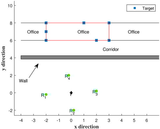 The objective is to estimate the target locations that are behind a wall. In this paper, we assume the region of interest is a region of size 20 m by 15 m. We consider the bi-static radar with multiple receivers (R). For example, when trying to map an office that is behind a wall, with a corridor in between, as shown in Figure 1. Unlike many ray-tracing studies, we do not assume a straight line reflector for internal walls; instead, we model the practical situation where these walls are made of plasterboard, and the RF reflectors come from the vertical metal studs that support the walls and doors. Here, the targets are the metal studs, and the aim is to estimate the target location of the metal studs.