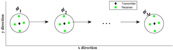 The measurements are taken as shown in Figure 2. The transmitter and receivers move together, from one place to another. At intermediate points () the receivers collect range measurements. In practice, an example is when the transmitter and receivers are mounted on a vehicle moving from one point to another collecting measurements at intermediate locations. At each intermediate point , range measurements are collected (N range measurements corresponding to N targets at each receiver). As the range measurements are collected at M intermediate points, there will be a total of range measurements.