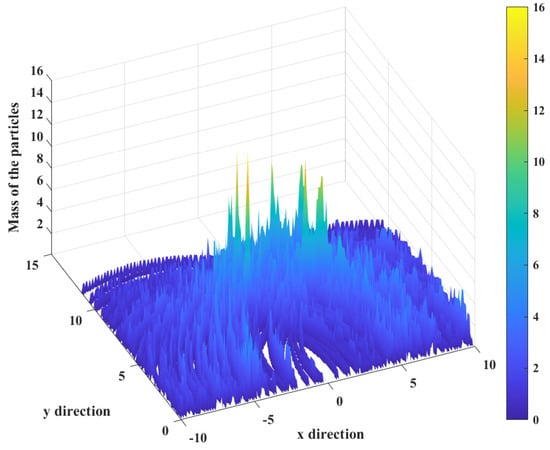 Surviving particles of the proposed algorithm at the end of 120th iteration for the same scenario as in Figure 13. The color scale indicates the mass of the particles.