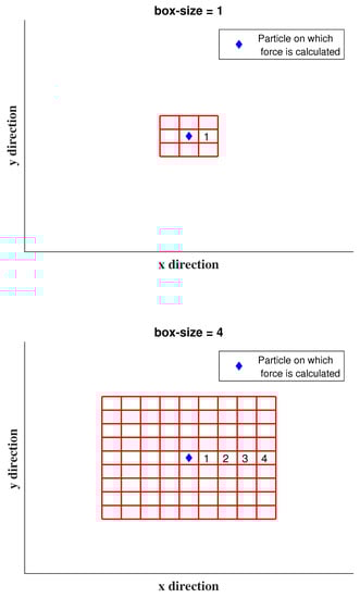 To calculate the force, we use the traditional Newtonian force formula, and propose to set the gravitational constant equal to one. In particular, the force on particle because of the particle is defined as . Where , and are the physical locations (measured in meters), and , and are the masses of the particles and , respectively. Similarly, we calculate the force from all the particles within the box. The resultant force on the selected particle is the vector addition of all the forces from individual particles.