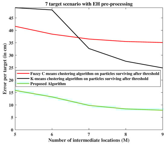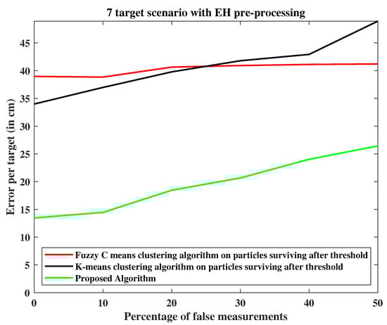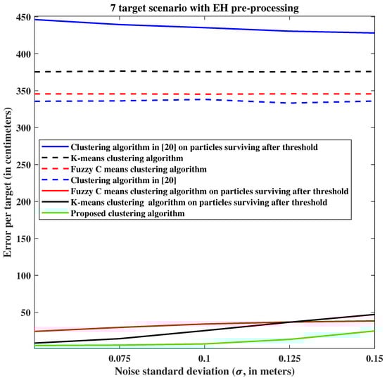 From Figure 7, we can see that proposed algorithm performs better than the other algorithms. For , the proposed algorithm has less error per target when compared to the best of the other three algorithms, which is either k-means or fuzzy c-means, depending on the level of noise. The proposed algorithm has an accuracy of 8 cm.