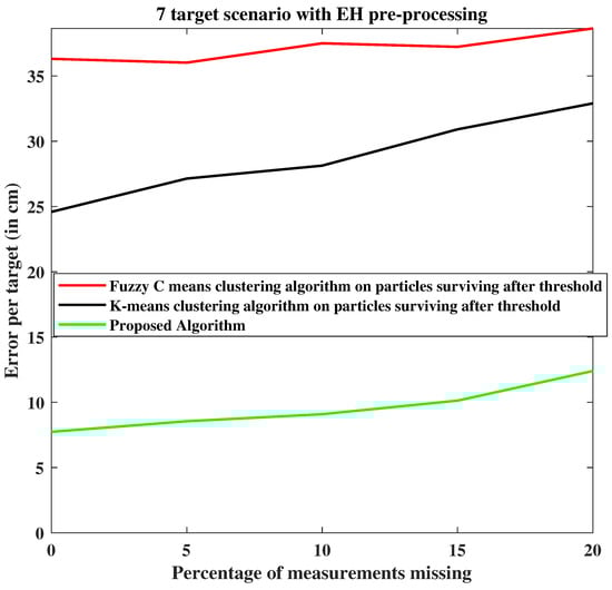 Figure 8 shows that the proposed algorithm performs better than the other two, even when some of the measurements are missing. From the figure, we can see that as the percentage of missing measurement increases, the error per target also increases. Results show that the proposed algorithm outperforms the existing algorithms and produce better results. The results are for the noise level .