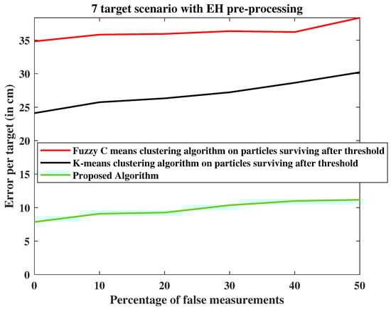 Figure 9 shows that the proposed algorithm performs better than the existing algorithm when some of the measurements are false measurements for the scenario in Figure 1 (i.e., 7-target scenario). False measurements arise when there is a strong reflection from the objects that are not targets (i.e., not of interest, e.g., reflection from the walls.) Figure 9 is plotted when there are no missing measurements. Figure 10 shows the proposed algorithms perform better than the existing algorithms when of measurements are missing and contains false measurements. From the figures, we can see that as the percentage of false measurement decreases, error per target also decreases. We also see that in both the scenarios (with and without missing measurements), the proposed algorithm outperforms the existing algorithms. The simulations are performed for the noise level .