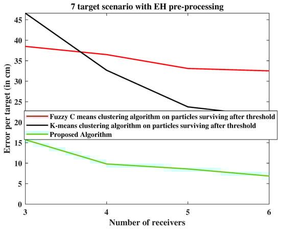 Figure 12 shows that the proposed algorithm performs better than existing for the different number of receivers for the scenario in Figure 1 (i.e., 7-target scenario). From the figure, we can see that error per target decreases as the number of receivers increases. The simulations are done for the noise level, and number of intermediate locations, .