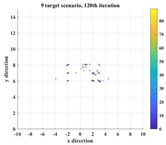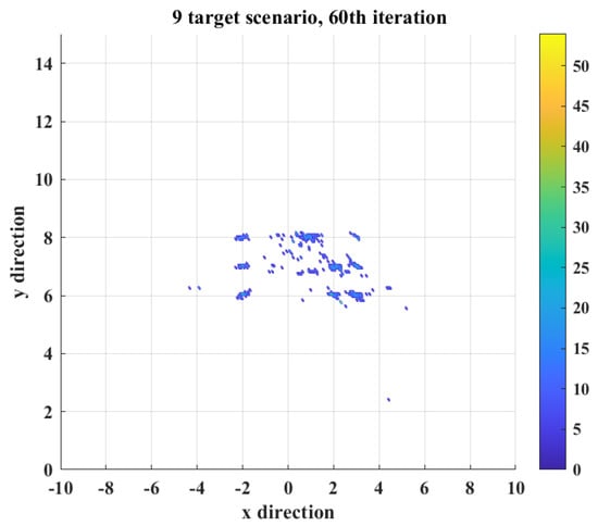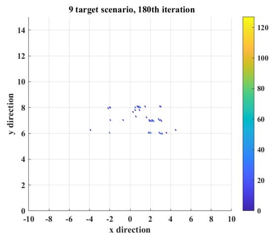 To illustrate how the proposed algorithm progresses, we have shown different stages of the algorithm in Figure 13, Figure 14, Figure 15 and Figure 16, for a 9 target scenario with noise level and 10% of measurements are missing. From the figures, it can be seen that as the proposed algorithm progress, the particles at non-target locations are removed iteratively. It can also be seen that as the algorithm progresses, particles around the target locations merge together (mass of the particles increasing from Figure 13, Figure 14, Figure 15 and Figure 16).