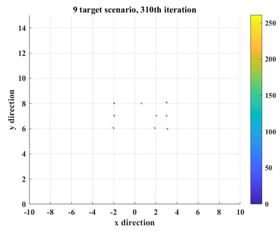 Surviving particles of the proposed algorithm at the end of 310th iteration for the same scenario as in Figure 13. The color scale indicates the mass of the particles.