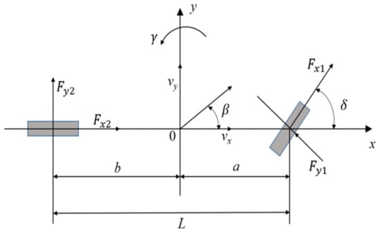 where , are respectively yaw rate and sideslip angle; and are respectively longitudinal vehicle speed and lateral vehicle speed; and are respectively distance from the center of gravity to the front axle and distance from the center of gravity to the rear axle; is the wheelbase; and are respectively longitudinal and lateral forces on the front axle; and are respectively longitudinal and lateral forces on the rear axle; and are respectively cornering stiffness of the front axle and cornering stiffness of the rear axle; and are respectively vehicle moment of inertia about axis and vehicle mass; and are respectively longitudinal acceleration and lateral acceleration; and is front-wheel steering angle.