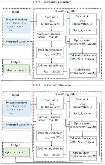 Figure 3 is the flowchart of EH∞KF based vehicle mass and state estimation. An EH∞KF estimates the vehicle mass in real-time to cope with the uncertainty of the model parameters, and secondly, the output of this EH∞KF is used as input to another EH∞KF to estimate the vehicle state in real-time. The specific iterative process of EH∞KF is as follows.